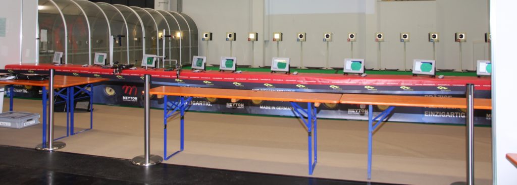 Im Vordergrund 12 elektronische Schießanlagen der Firma Meyton auf denen der Messe Cup ausgetragen wird und links der gläserner Schießstand des BSSB.