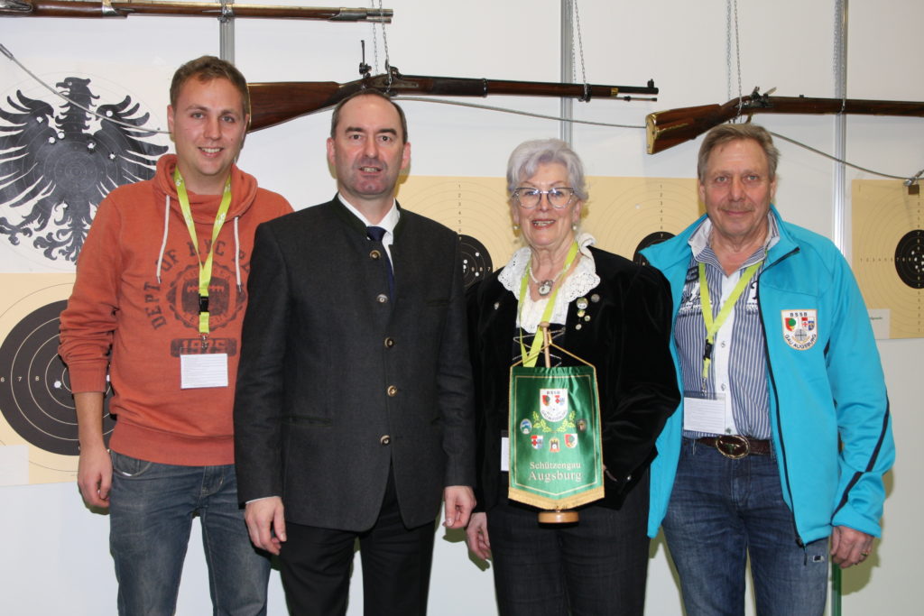 Hubert Aiwanger stellvertretender Ministerpräsident von Bayern und Staatsminister für Wirtschaft, Landesentwicklung und Energie am Infostand des Schützengaues Augsburg (v. links: 1. Gau Jugendleiter Stefan Sohr, Staatsminister Hubert Aiwanger, Gau Helferin Annemarie Wiedemann und 1. Gau Sportleiter Peter Huber)
